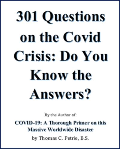 This book was started as a project to offer a "free" bonus to those who purchsed my Covid book (w/co-author Dave Pihlcrantz). However, it is being offered on this website on its own as a stand-alone item. This challenging e-book with 301 questions is best suited to those who have at least a little background on this topic, otherwise, I suspect many readers will throw up their hands in bewilderment! But since it's being offered for just $5.00, it could be a good little e-book for conversations with your open-minded friends! Also, most answers are found in our 111,000 word book, "Covid-19, A Thorough Primer on this Massive Worldwide Disaster."